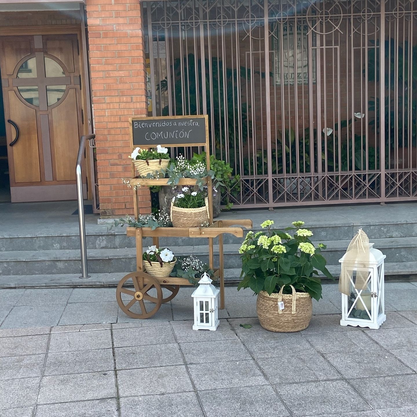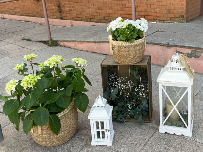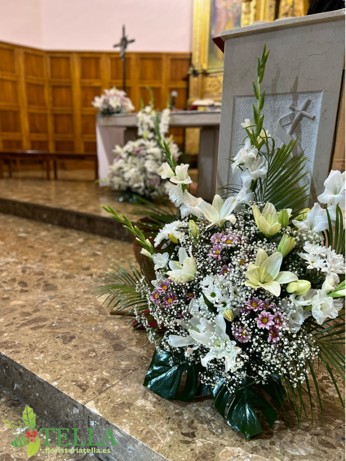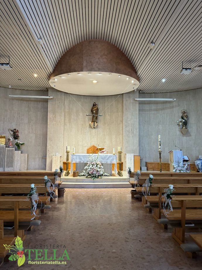 Trabajamos con flor fresca y verde variado para conseguir volumen y una iglesia “llena” en directo y en foto.