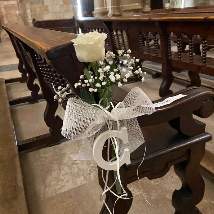Adorno sencillo de flor con lazo o podéis complementarlo con la inicial de los protagonistas del día.